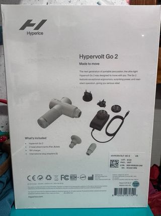 Masajeador de percusión portátil Hypervolt Go 2 de Hyperice. Diseño ligero y compacto. - 3 velocidades. - Motor brushless de alto torque de 40W. - Tecnología QuietGlide patentada. - Diseño ligero (0.7 kg). - Batería de 3 horas de duración. - Aprobado para equipaje de mano por la TSA.