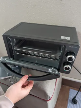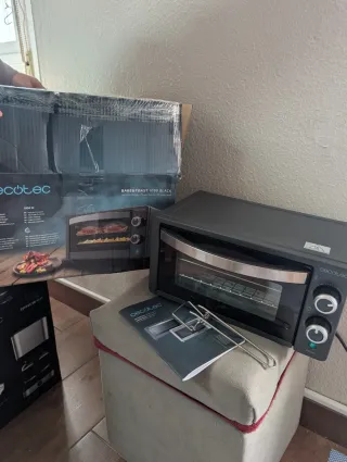 Horno eléctrico compacto de sobremesa Cecotec, ideal para cocinas con espacio limitado. Su diseño moderno se adapta a cualquier estilo. - Color: Negro. - Acabado: Mate. - Puerta con cristal. - Bandeja y rejilla incluidas.