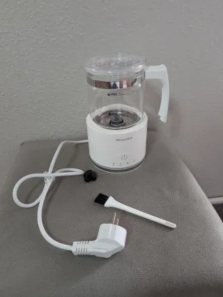 Espumador de leche Morpilot con base y accesorios. - Jarra de cristal. - Base blanca. - Incluye cepillo de limpieza y tapón.