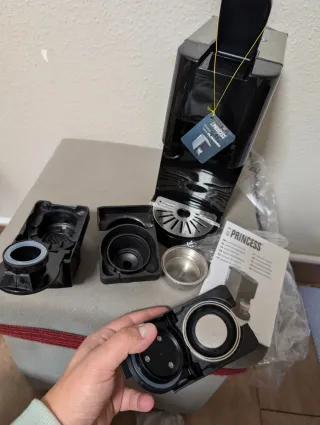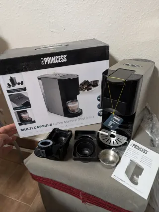 Cafetera Princess Multi Capsule Steel 4-in-1. Incluye varios accesorios para diferentes tipos de cápsulas. - Diseño moderno en acero y negro. - Incluye adaptadores para cápsulas. - Base para taza. - Manual de instrucciones.