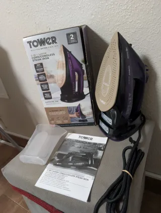 Plancha de vapor Tower 2 en 1, con función con y sin cable. - Potencia de 2400W. - Depósito de 360ml. - Incluye base y accesorios. - Color morado y negro.