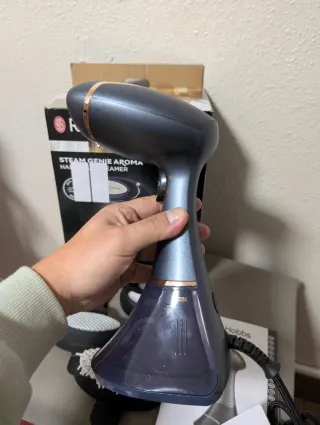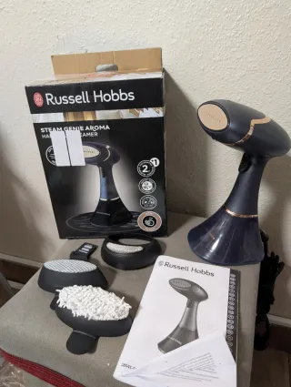 Plancha de vapor vertical Russell Hobbs Steam Genie Aroma. Ideal para refrescar y eliminar arrugas de la ropa. - Diseño ergonómico. - Incluye accesorios. - Color azul marino y detalles dorados.