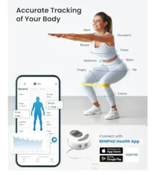 Cinta Métrica Corporal con Aplicación, Cinta Métrica Digital e Inteligente RENPHO con Bluetooth para Medir el Cuerpo, Pérdida de Peso, Fitness, Retráctil, Mide la Circunferencia de la Parte del Cuerpo Color Gris-blanco Marca RENPHO Dimensiones del producto 7l. x 7an. centímetros Precisión de medición 0.1cm Tipo de material de la caja Plástico Tipo de bloqueo Manual de instrucciones