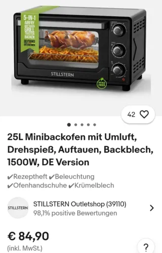 Minihorno Stillstern con convección (45 L), versión alemana, 13 programas, accesorios: 2 bandejas, asador, guantes de horno, pantalla LED, 2000 W