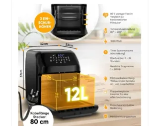 Nota : falta libro . freidora de aire caliente Stillstern de 12 l con pantalla táctil LED xxl recebook en alemán 12 programas precalienta los alimentos /mantiene los alimentos Marca Stillstern Número de modelo 1237 Color Negro Dimensiones del producto ( L x W x H ) 33 x 32 x 37 cm; 7,4 kg Capacidad 12 litros Potencia / Potencia 1800,00 Voltaje 240 voltios Material Metal