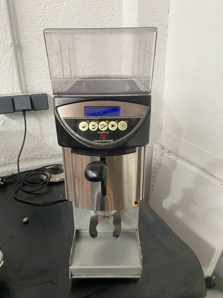 Molino de café profesional Mythos Nuova Simonelli. Diseñado para un molido preciso y consistente - Cuerpo de acero inoxidable. - Tolva de plástico transparente. - Panel de control con pantalla digital. Molino profesional de más de 2000 euros de PVP. Oportunidad única. Tiene partida la tapa superior de la tolva, pero con un poco de pegamento se dejaría perfecta. Se regala tolva unidosis para entornos domésticos.