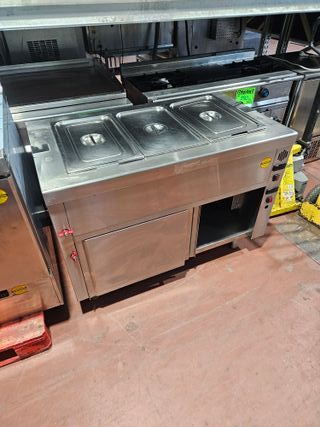 Mesa caliente en muy buen estado y poco uso, parte superior bañomaría para cubetas gastronorm, se puede cambiar a varios tamaños, parte inferior tipo armario con mantenedor caliente de doble puerta, con doble termostato de calor. Medidas exteriores 1200x700x850. IVA no incluido. Toda nuestra maquinaria tiene una garantía en repuestos de 1 año para maquinaria nueva y 3 meses en usada. Todo en maquinaria y mobiliario de hostelería, supermercados y alimentación. Estamos en Torrejón de la Calzada (Madrid) C/ Segunda Avenida 13, Pol. Ind. Las Avenidas, salida 28 de la carretera de Toledo A42. Envíos económicos a toda España.