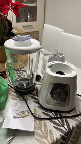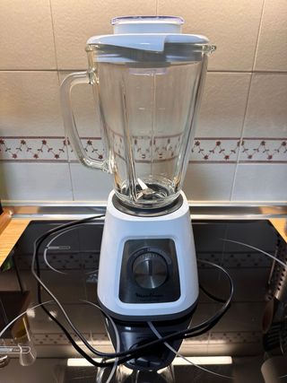 Batidora de vaso Moulinex con jarra de cristal. Muy poco uso ya que me regalaron la Thermomix. - Potencia de 800W. - Capacidad 1,5 litros. - Jarra de cristal. - Diseño moderno en color blanco.