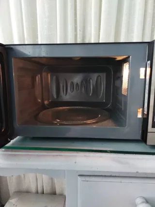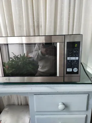Microondas LG en buen estado, ideal para tu cocina. Su diseño moderno se adapta a cualquier espacio de color negro y acero inoxidable e interior de en gris digital funcionando perfectamente