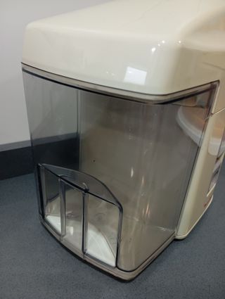 Cafetera dolce gusto (grande) Funciona bien, lo único que no se puede dejar agua en el recipiente porque se sale. - Cuerpo blanco con salpicaduras de pintura en tonos marrones, verdes, azules, naranjas y morados. - Botón de encendido con luz verde. - Bandeja de goteo metálica.