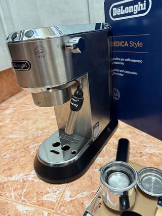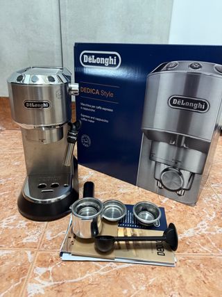 Cafetera DeLonghi Dedica Style en acabado de acero inoxidable. Diseñada para preparar espresso y cappuccino. - Incluye portafiltros y accesorios. - Diseño compacto y elegante.