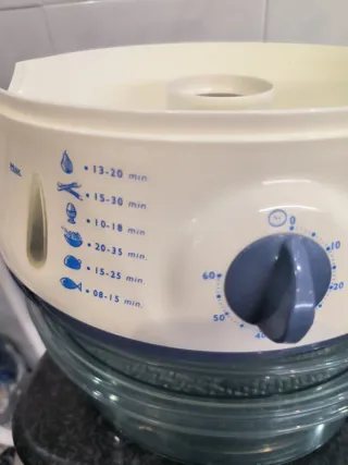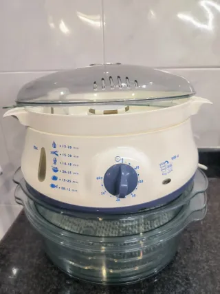Cocedor al vapor, ideal para preparar alimentos de forma saludable. Incluye varios niveles para cocinar diferentes alimentos a la vez. - Indicaciones de tiempo para diferentes alimentos: frutas (13-20 min), verduras (15-30 min), huevos (10-18 min), pescado (15-25 min) y carne (08-15 min). - Indicador de nivel de agua.