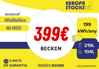 Combi de la marca Becken. NO FROST 185x60x65cm 323L CLASE D GARANTÍA 3 AÑOS - Diseño moderno y elegante. - Acabado en color gris.
