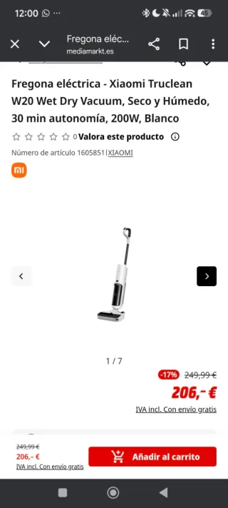Aspiradora fregadora Xiaomi Truclean W20 en color blanco. Diseñada para una limpieza eficiente en seco y húmedo. - Autonomía de 30 minutos. - Potencia de 200W. - Incluye base de carga. Aspira y friega al mismo tiempo. Usada un par de veces, está en perfecto estado.