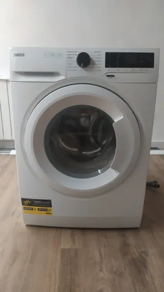 Lavadora de carga frontal Zanussi en color blanco. Diseño moderno y funcional. - Panel de control con programas. - Puerta frontal. - Etiqueta de eficiencia energética - Totalmente nueva. No se ha usado. Se vende por error de tamaño en la compra