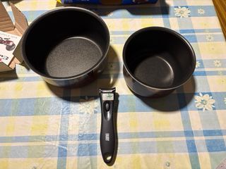 Set de ollas Tefal Eureka Optimal, diseñadas para ser apilables y ahorrar espacio. - 2 cazuelas de 14 cm y 18 cm. - 1 mango extraíble. - Para uso en gas y vitroceramina, No inducción. - publicidad en el mango