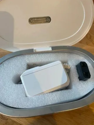 Máquina esterilizadora con tecnología UV para desinfección. - Diseño compacto y moderno. Good for dental aligners, cleaning of jewelry or glasses. You need special liquid to clean specific metals Voltage:DC12V Power:30W size: 191mm*112mm*83mm Vibration frequency: 45000HZ Fleaning tank size:167mm*88.7mm*47 mm stainless steel inside capacity:600ml Has a neon UV blue light inside also - Indicador luminoso circular.