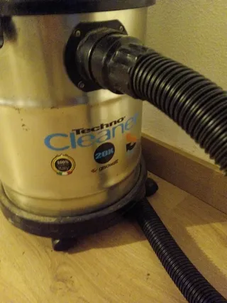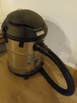 Aspirador industrial de gran capacidad, ideal para limpieza profesional o de garajes. - Tambor de acero inoxidable. - Manguera flexible. - Ruedas para fácil movilidad.
