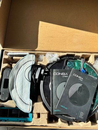 Robot aspirador Conga Cecotec. Potencia de succión 2.200 Pa Tipo navegación SmartGyro 3.0 (sensores giroscópicos, proximidad, antichoque, anticaída) Autonomía Hasta 160 minutos Tipo de mopa TwinFloor (doble material, para fregado eficiente - Incluye manuales. - Base de carga. - Mopa de limpieza.