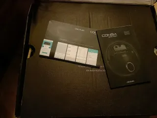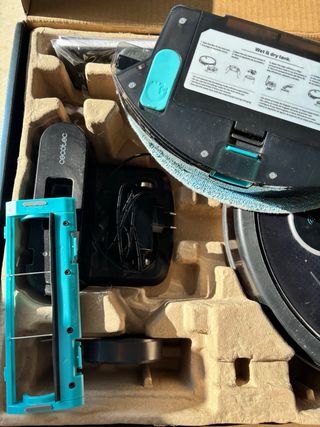 Robot aspirador Cecotec en su caja original, con algunos accesorios. - Robot aspirador. - Base de carga. - Accesorios. - Manuales.