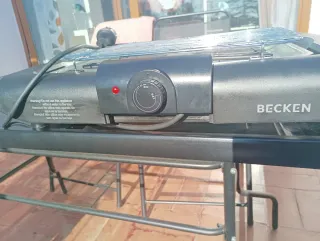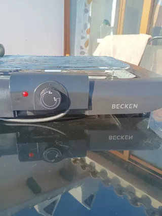 Grill eléctrico de la marca BECKEN, ideal para usar en exteriores. - Potencia regulable. - Indicador luminoso de encendido. - Bandeja para agua.