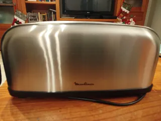 Vendo SIN USO esta tostadora Multipan Moulinex Serie T-30. Una elegante tostadora retro de acero inoxidable con un irresistible encanto vintage Diseño de cara abierta que ofrece una visión completa del proceso de tostado Tuesta todo tipo de pan —desde baguette hasta blini— con hasta 4 rebanadas a la vez Una estructura compacta que ofrece un manejo fácil y un almacenamiento sin esfuerzo Asas de extracción que se mantienen frías para tostar con total tranquilidad. MAS COSAS EN MI PERFIL Envio por Wallapop o entrego en mano en Madrid Capital.