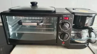 Práctico electrodoméstico 3 en 1 que combina horno tostador y cafetera. - Diseño compacto en color negro. - Tapa de cristal para el horno. - Controles de temperatura y tiempo para el horno. - Cafetera con jarra de cristal Permite preparar café,tostar pan, y cocina otros alimentos como huevos o salchichas directamente Funciona perfectamente. Su precio real está en 108 E.