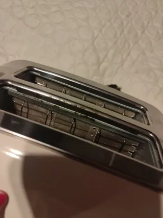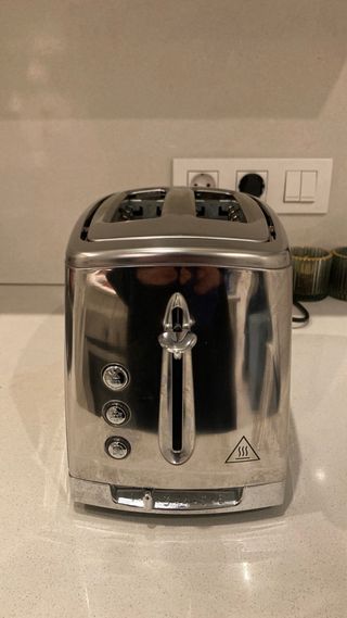Tostadora de la marca Russell Hobbs con acabado metálico. - Ranuras amplias para diferentes tipos de pan. - Rejilla superior para calentar bollería. - Panel de control con selector de tostado. Funciona perfectamente pero tiene - la rejilla superior esta ligeramente torcida pero jo afecta su funcionamiento - la manilla de plástico para bajar la palanca y encender la tostadora esta despegada y rota como se ve en la foto. No afecta el funcionamiento pero al estar pegada se puede despegar con el uso. Hay que bajarla con cuidado)