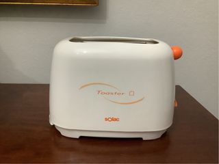 Tostadora eléctrica marca Solac, color blanco con detalles en naranja. Funciona correctamente y está en buen estado. Diseño sencillo y compacto, ideal para uso diario en cocina. Perfecta para tostar pan de molde y rebanadas finas. Se vende por no usar.
