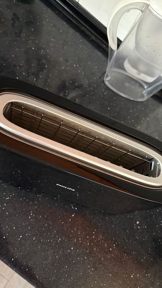 Tostadora de pan de la marca Philips en color negro. - Diseño moderno y compacto. - Ranuras amplias para diferentes tipos de pan.