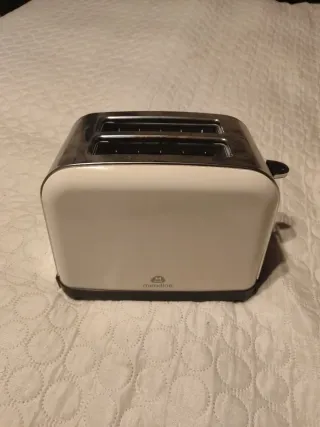 Tostadora eléctrica de color blanco con dos ranuras para tostar pan. - Diseño moderno y compacto. - Carcasa exterior de plástico. - Ranuras amplias para diferentes tipos de pan. Funciona perfectamente. Se vende por mudanza Las medidas son aproximadas por su diseño ovalado