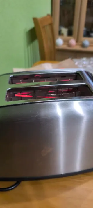 Tostadora Russell Hobbs de acero inoxidable. Funciona perfectamente y calienta muy rápido. Al haberse usado puede tener dentro polvito de pan, pero está perfecta.