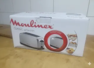 Tostadora de la marca Moulinex. - Acabado en acero inoxidable. - Diseño moderno. 1400w de potencia 2 ranuras extralargas y anchas para hasta 4 rebanadas de pan a la vez. 6 niveles de tostado ajustables. Funciona de stop. Solo tiene una pequeña abolladura que no afecta al funcionamiento. Nueva a estrenar