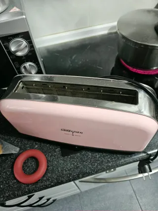Tostadora de color rosa con acabado metálico. - Diseño moderno. - Ranuras amplias para el pan.