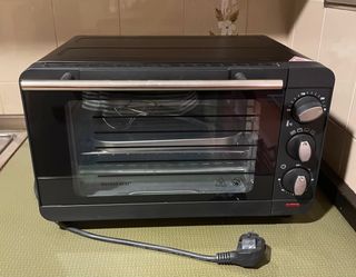 Mini horno 1200 W con 3 funciones de cocción/ grill (calor superior, calor inferior, calor superior e inferior). Incluye una parrilla de acero inoxidable, una bandeja de acero revestido de aluminio, pinzas revestidas de cromo y una bandeja recogemigas extraíble.