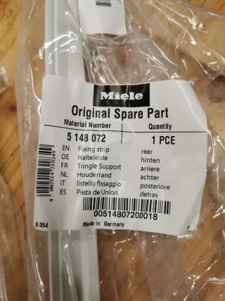 Soporte de cristal trasero para balda o estantería de frigorífico de la marca Miele. 4 unidades disponibles a estrenar. Precio por unidad. Medidasen las fotos. - Pieza de repuesto original. - Diseño en forma de barra. - Acabado plateado.