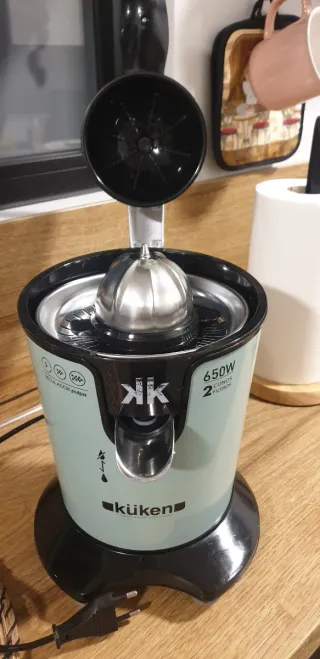 Exprimidor de zumo de la marca KUKEN en color verde menta. - Potencia de 650W. - Incluye 2 conos y 2 filtros. - Regulador de pulpa.