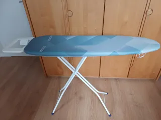 Tabla de planchar Leifheit con un diseño moderno y funcional. - Cubierta con estampado geométrico en tonos azules (con una pequeña mancha). - Soporte lateral blanco para plancha o ropa. - Patas plegables de metal blanco. - Dimensiones tabla: 114 x 33 cm. - Estado: Usado, con alguna mancha que no impide la funcionalidad, como se ve en las fotos.