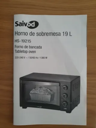 Horno eléctrico compacto Saivod de 19 litros. - Modelo: HS-19215 - Tipo: Horno de sobremesa / bancada - Capacidad: 19 L - Voltaje: 220-240 V - Potencia: 1380 W Incluye manual de instrucciones.