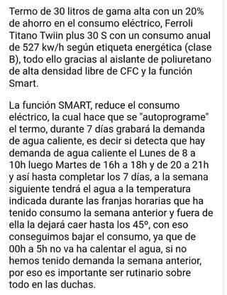 30 litros. Especial para lugares con poco fondo ( solo 27'4 cm de fondo) lo que lo hace adecuado para meter en un mueble de cocina. Sin estrenar y con factura de septiembre de 2024 y 2 AÑOS de GARANTIA FERROLI TOTAL (INCLUYE: desplazamiento, mano de obra y recambios) y 3 AÑOS PARA RECAMBIOS. FUNCION SMART CON WIFI Y APLICACION MOVIL. MEMORIZACION de HABITOS y HORARIOS DE DUCHA PARA CALENTAR EL AGUA ESPECIALMENTE EN ESAS HORAS, ETC. LEER LAS CARACTERISTICAS EN LAS FOTOS PARA MAS DETALLE.