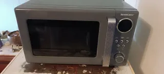 Microondas SilverCrest en color gris, con un diseño retro. - Panel de control con botones y dial. - Puerta con ventana. - Marca: SilverCrest.