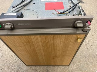 Nevera trivalente de la marca Electrolux. Ideal para caravanas o campers. - Diseño con acabado imitación madera. - Tirador dorado. - Panel de control con selector.