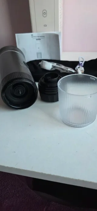 Cafetera portátil para preparar espresso en cualquier lugar. Incluye accesorios para su uso. - Diseño compacto y moderno. - Incluye cuchara medidora. - Cable de carga USB tipo C.
