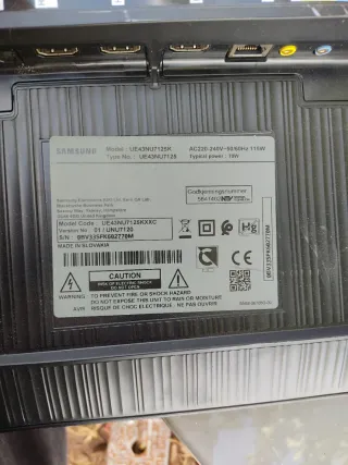 Placa base de repuesto para TV Samsung. - Modelo: UE43NU7125K - Tipo: UE43NU7125 - Código de modelo: UE43NU7125KXXC - Versión: 01/UNU7120 - S/N: OBV33SFK602770M - Fabricado en Eslovaquia.