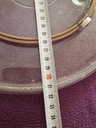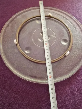 Plato giratorio para microondas en buen estado. - Material: vidrio resistente. - Color: transparente. - Incluye el soporte de plástico.