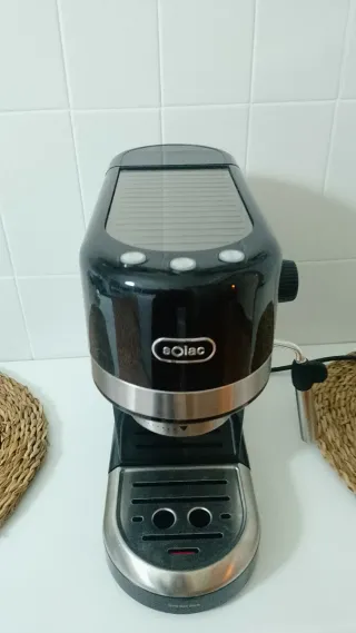Cafetera de espresso de la marca Solac, en acabado negro brillante. - Diseño moderno y compacto. - Panel de control con botones. - Vaporizador para espumar leche. - Bandeja de goteo extraíble.