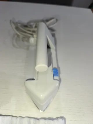 Plancha de viaje Philips modelo World Stewardess, compacta y fácil de usar. - Diseño blanco y azul. - Ajuste de temperatura variable.