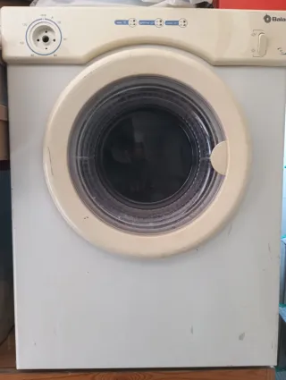 Secadora de ropa de la marca Balay. Su diseño es blanco y cuenta con un panel de control superior. - Panel de control con dial y botones. - Puerta frontal redonda con cristal. - No tiene temporizador ni programador. Funciona cerrando la puerta.
