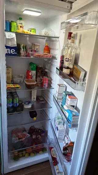Frigorífico de color blanco, con varios estantes y cajones. - Diseño interior espacioso. - Estantes de cristal. - Cajones transparentes.