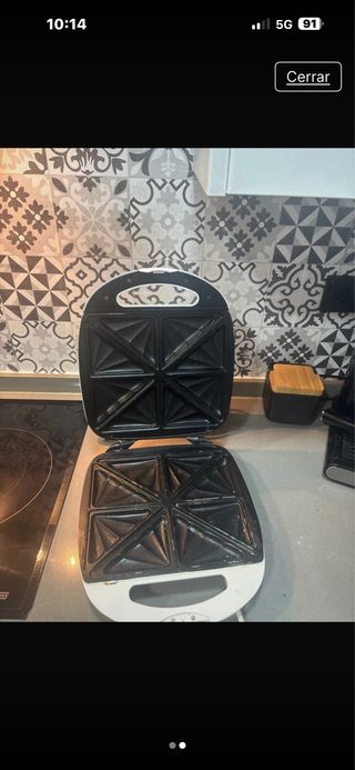 Parrilla eléctrica Masterchef en color negro, ideal para preparar sándwiches y otros alimentos. - Diseño moderno y compacto. - Indicador luminoso de encendido. - Asa metálica frontal.